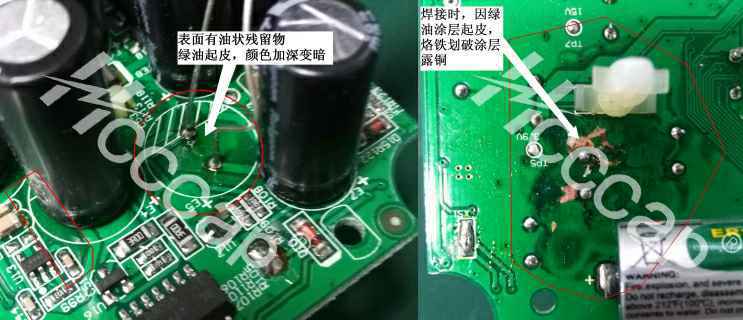 2. 高低电位间距较小的地方,电腐蚀强度更大,反应发生区域PCB走线腐蚀破坏或其他器件受影响失效,整版性能受损。【PCB损坏】